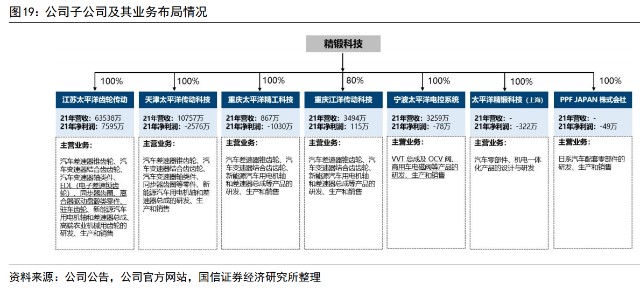 公司总部下设子公司,实现国内国外同步布局,全球视野,竞争优势明显,包括江苏太平洋齿轮传动、宁波太平洋电控系统、天津太平洋传动科技、重庆太平洋精工科技、太平洋精锻科技(上海)、太平洋精锻科技日本株式会社以及控股子公司重庆江洋传动科技有限公司。