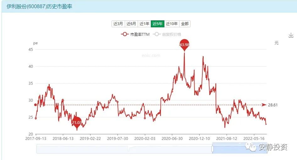 近5年伊利股份的平均PE为28.6,目前的PE为23,处于近5年的3.1%分位,处于底部区域。