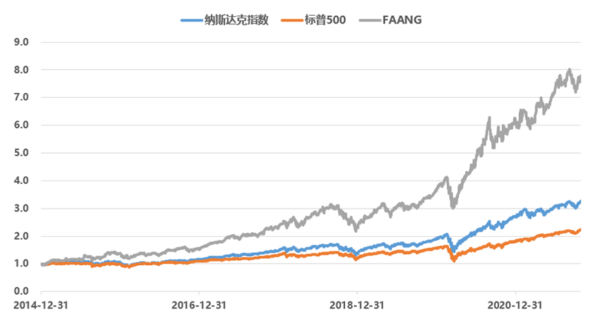 而美国五大数字经济龙头公司(简称“FAANG ”), Facebook(FB)、苹果(AAPL)、亚马逊(AMZN)、奈飞 Netflix(NFLX)和谷歌母公司 Alphabet(GOOG),2015 年至今,FAANG 市值加权组合上涨 627%,同期纳斯达克指数上涨 206%,标普 500 上涨 109%。从全球市场表现来看,其涨幅远高于其他板块。