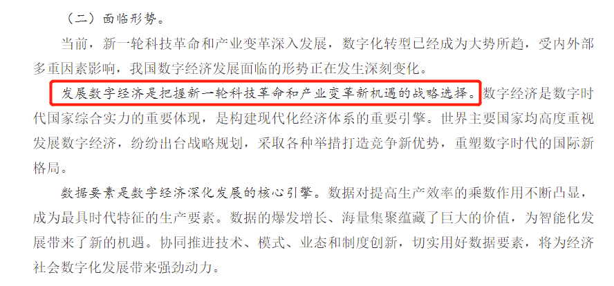 2022年1月12日,国务院发布《“十四五”数字经济发展规划》。仅仅是开篇第一大点,便凸显数字经济的战略地位: