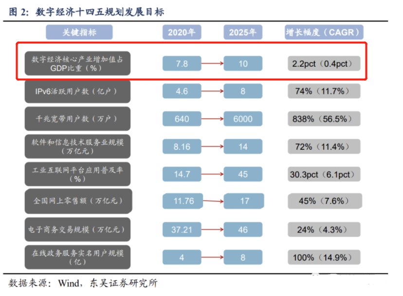 假设在十四五期间GDP增长年均增长5%,如果数字经济核心产值从7.8%提高到10%,年均增长率或将达到10.41%,远高于GDP的年均增速。