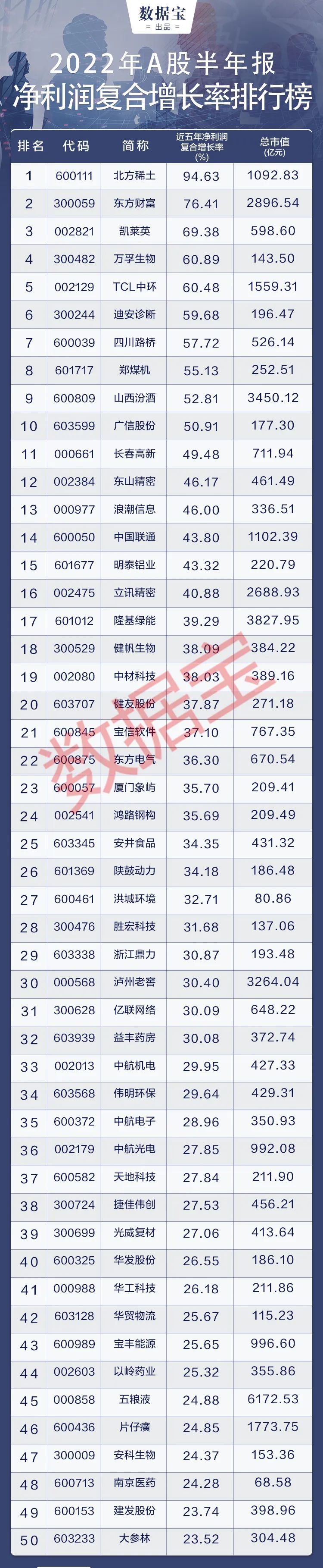 数据选取近五年半年报净利润连续增长且2017年净利润超亿元的上市公司为对象,发布《2022年A股半年报净利润复合增长率排行榜》,北方稀土以94.63%的复合增速登顶榜首,远超第二位东方财富的76.41%,也是榜单前十名中唯一的资源股。