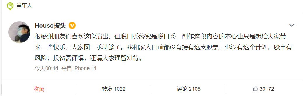 13日凌晨热搜登顶后,House发布最新回应,称“我和家人目前都没有持有这支股票,也没有这个计划。股市有风险,投资需谨慎,还请大家理智对待。”