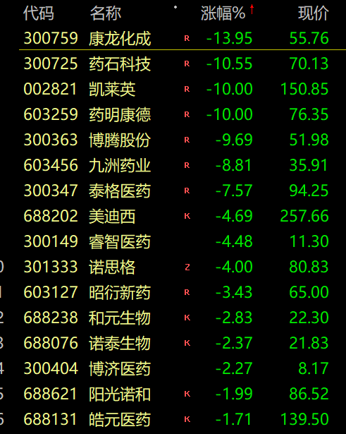 CRO概念午后跌幅扩大,康龙化成跌超13%,药石科技、凯莱英、药明康德跌停,博腾股份、泰格医药、美迪西、九洲药业跌幅靠前。