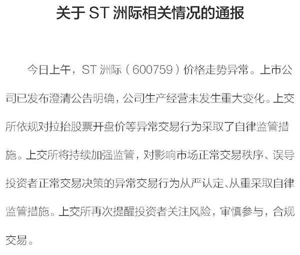今日上午,ST洲际(600759)价格走势异常。上市公司已发布澄清公告明确,公司生产经营未发生重大变化。上交所依规对拉抬股票开盘价等异常交易行为采取了自律监管措施。上交所将持续加强监管,对影响市场正常交易秩序、误导投资者正常交易决策的异常交易行为从严认定、从重采取自律监管措施。上交所再次提醒投资者关注风险,审慎参与,合规交易。