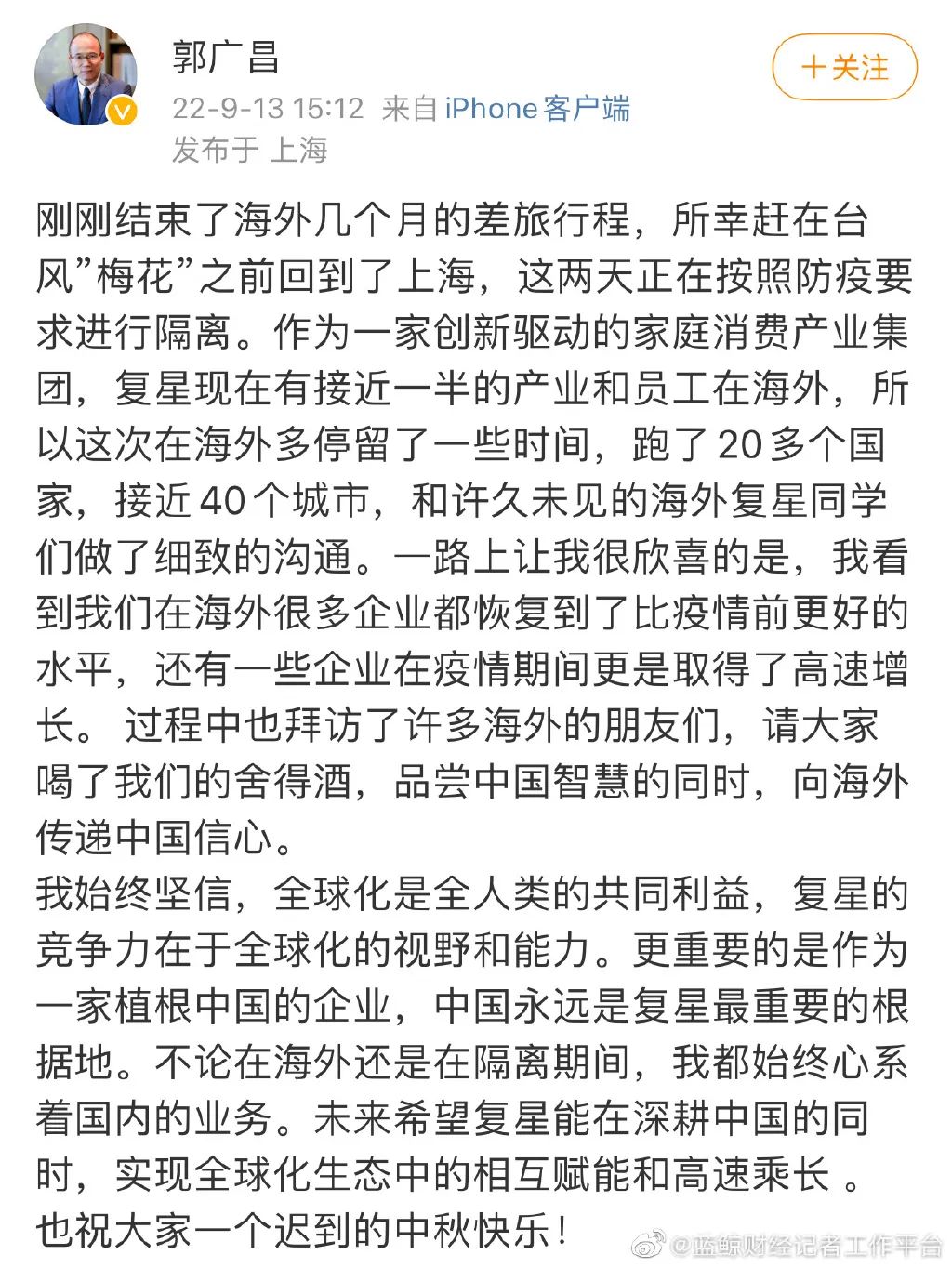 郭广昌回国: