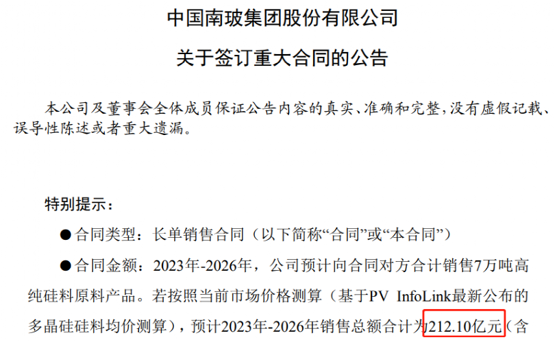 根据南玻A和天合光能两家公司的公告,此次销售协议属于长单销售合同,基于该合同约定,2023年-2026年,南玻A预计向合同对方合计销售7万吨高纯硅料原料产品。若按照当前市场价格测算(基于PVInfoLink最新公布的多晶硅硅料均价测算),预计2023年-2026年销售总额合计为212.10亿元(含税)。