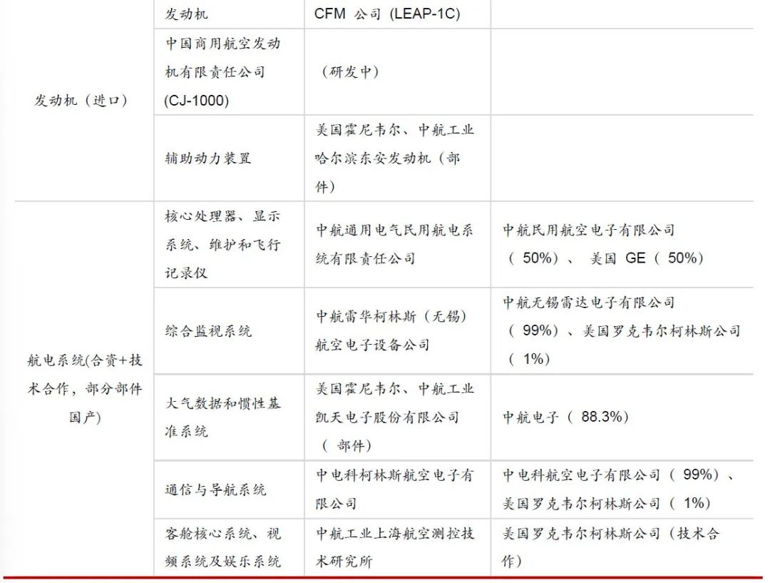 而客用飞机的航电、飞控、发动机等核心子系统,我们在技术领域还相对薄弱,例如在C919的制造过程中,这些子系统产品大多来自海外供应商与中国公司在国内建立的合资子公司,主要是和美国的通用电气、柯林斯、霍尼韦尔、古德里奇等公司,法国的泰雷兹公司,德国的利勃海尔公司等海外供应商进行合作。