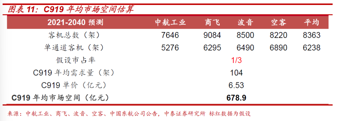 中泰证券根据中国商飞、波音公司、空客公司、中航工业四家企业的预测值并取其平均值,预测我国未来20年新增客机需求8363架,其中单通道客机需求6238架,平均每年新增客机418架,单通道客机312架。假设未来C919国内市场占有率能够和波音、空客持平,即市占率达到三分之一,则未来20年C919每年销量约为104架。