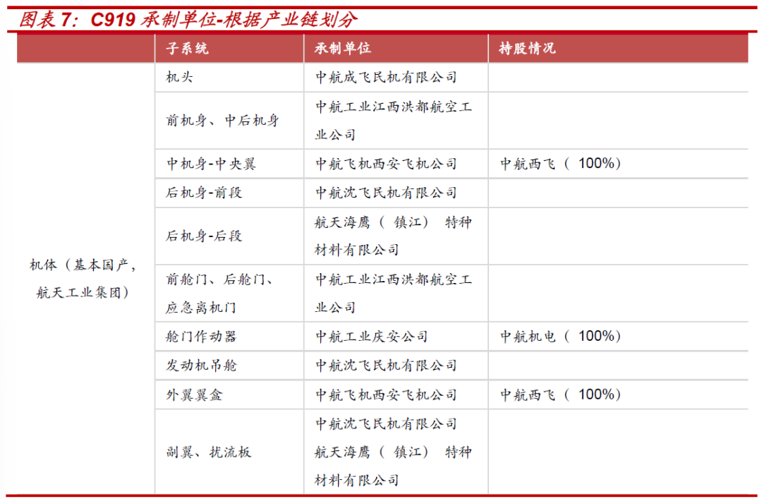 从上下游产业链来看,机体制造会对上游原材料产生需求,像光威复材、宝钛股份等公司也将受益。在C919客机航电系统和机电系统制造方面,虽然目前还要依靠和国外供应商合资建立公司的方式进行合作,但像中航光电、中航机电、中航电测、中航电子等众多上市公司也参与其中,提供分系统或元器件产品。
