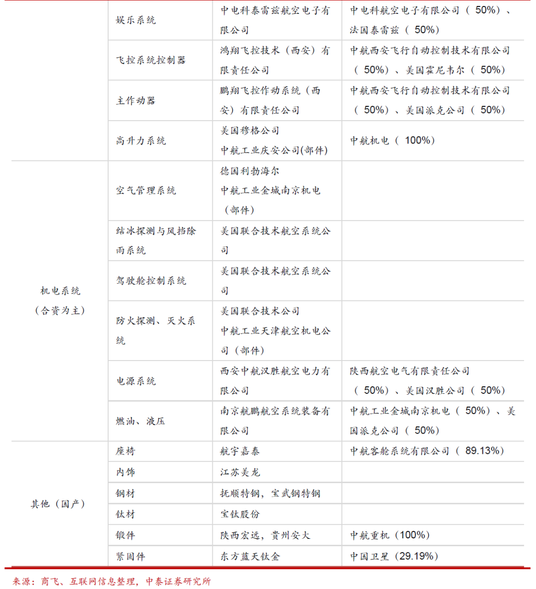 当前商飞集团已培养一系列国内外供应商并给予评级,其中国内上市公司/上市公司控股或参股的供应商包括机身类、航电/机电类、材料机加工类、金属/非金属特种材料类等多家企业: