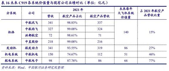 若将大飞机制造环节进行价值拆分,则前瞻产业研究院数据显示,机体、发动机、机电系统、航电系统和其它等部分的价值占比约为36%、22%、13%、17%和12%——按C919每年销售额 679.1 亿元估算,则上述五个系统的年价值量分别对应为244.4、149.4、88.3、115.4、81.5亿元。