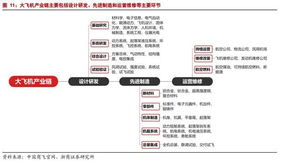 从产业链角度来看,大型客机的产业链长度长、复杂度高。大飞机产业链包括:设计研发、先进制造(新材料、零部件、机体制造、机载系统、总装集成)、运营维修。
