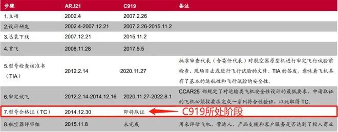 从飞机立项到取得生产许可证,需经过多项步骤。如今,C919已完成最艰难、耗时最长的前六个环节。目前,C919客机已完成历时5年的取证试飞工作,等待获颁型号合格证,最快本月取证,并计划年内向首个客户东航交付首架飞机。