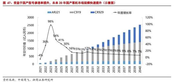 浙商证券分析师邱世梁7月19日发布的研报中指出,中国商飞三款产品ARJ21支线客机、C919大型客机、CR929远程宽体客机具有跟波音、空客等主要产品一较高下的能力。预计2031年以后,国产客机实现全系列量产,国产民机市场规模爬升到千亿以上。
