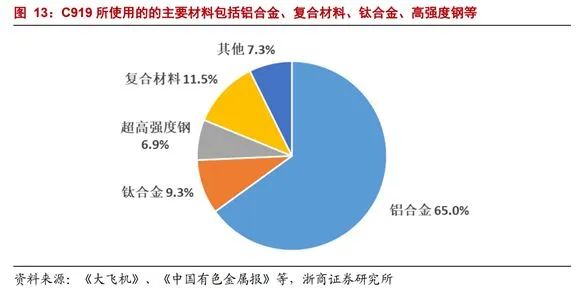 C919的新材料应用比例高于对标机型波音737、空客320,多种新材料更是首次大规模应用于民机。邱世梁指出,其中铝合金占C919飞机总净质量的65%,中国铝业和南山铝业有相关业务;钛合金使用量在机体结构重量占比达9.3%,宝钛股份是行业龙头,西部超导产品毛利率高;超高强度钢占比约6.9%,宝钢股份和抚顺特钢是钢铁巨头;复合材料结构占比11.5%,涵盖机身、尾翼、活动面、雷达罩、发动机、刹车等,中航高科、光威复材、中简科技、中复神鹰、恒神股份、楚江新材有相关布局。