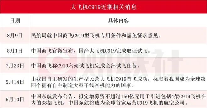 据不完全统计汇总,近期大飞机C919利好消息不断。