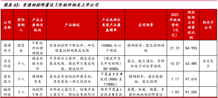 公司方面,目前有源相控阵雷达T/R组件相关的有10家上市公司。