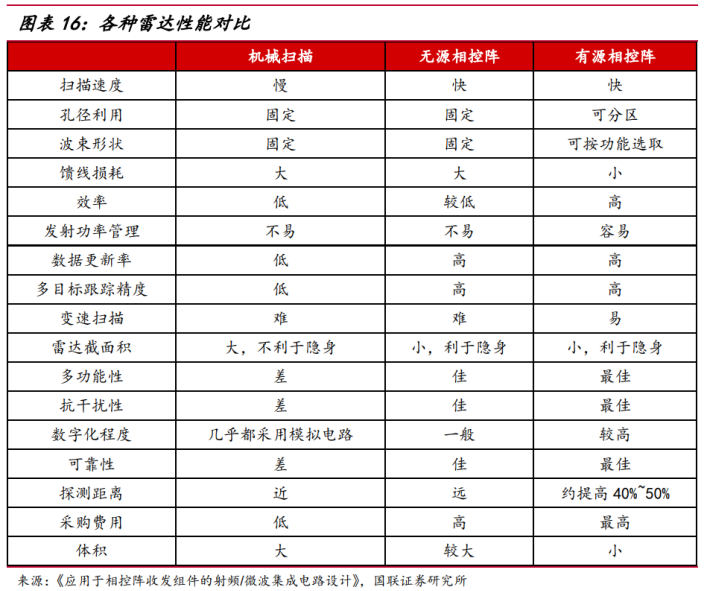 相控阵雷达根据天线的不同分为无源相控阵雷达和有源相控阵雷达。相比于机械扫描雷达及无源相控阵雷达,有源相控阵雷达在功耗、分辨率、可靠性等方面均有优势。