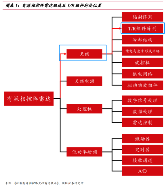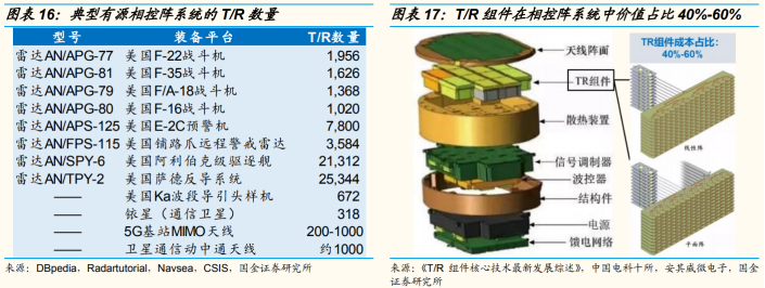 而TR组件是有源相控阵雷达的核心组成,价值量最高的部分。据国博电子招股书,有源相控阵雷达造价高昂,一部有源相控阵雷达天线系统成本占雷达总成本的70%-80%,而TR组件又占据了有源相控阵雷达天线成本的绝大部分。