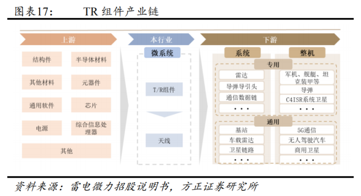 从产业链来看,TR组件上游为芯片、结构件、元器件等材料;中游为TR组件制造以及相控阵天线集成测试;下游为雷达、通信、电子对抗等整机。芯片成本约占TR组件价格构成的29%,是TR组件核心原材料。