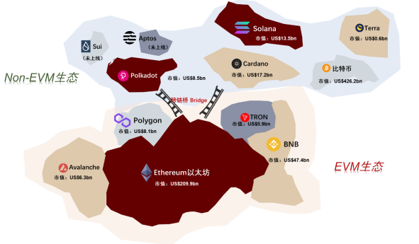 抛开以太坊,也存在一些公链选择从头开始,不以EVM为基础。这样做的好处是历史包袱轻,可以尝试新的想法和技术从而实现低费用和高扩展性,但缺点在于无法直接利用以太坊现成的智能合约。为了能与 EVM生态交流,这些公链一方面尝试用跨链桥连接到以太坊上的资产;另一方面也在尝试EVM上的智能合约移植方案,将solidity编写的合约部署到非EVM公链上,如NEAR的Aurora协议。