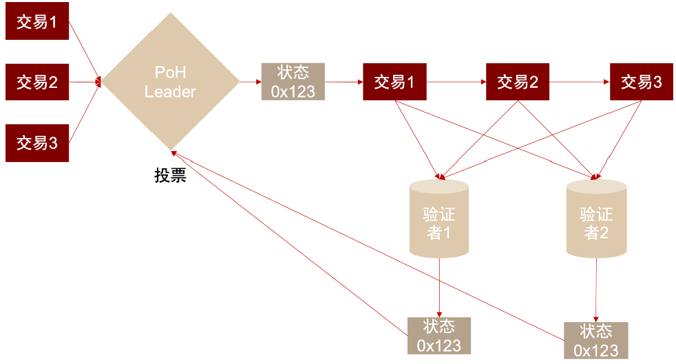 PoH + PoS共识机制结合,加快共识达成速度。在Solana的PoH机制设计中,首先选出一个不负责验证的节点leader,所有交易信息要经过leader排序,同时leader会串行地计算出每笔交易与之前交易的哈希值并产生区块,其他节点从leader处获取到区块,可以并行验证区块上数据是否一致,从而提高了效率。排序的leader通过PoS选举出来的,如果产生意见分歧就重新选举leader,同时集群通过轮换leader来最大限度地减少恶意leader的影响。