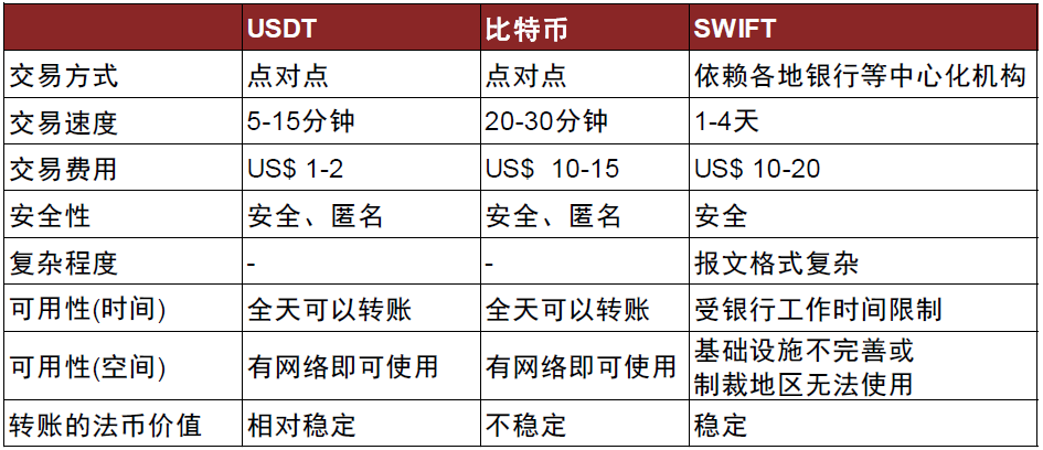 其次是公链的交易效率。此处我们可以引入合作组织SWIFT进行对照,SWIFT是目前全球领先的清算组织,其合作组织的形态实际上提高了信息传递效率。但相比之下,SWIFT的繁文缛节仍较多,效率放在现在来看并不高(一次清算过程可能需要几天),遇到部分国家清算系统较为落后的情况可能无法推进,并且整套清算系统仍然要依赖各地银行等中心化机构。而区块链提倡采用点对点的去中心化交易模式来交易加密货币,理论上不受任何时间及地域的限制,且速度快、费用低,智能合约可以进一步减少流程中的摩擦成本。但是问题在于,加密货币本身币值波动较大,不适于日常的交易活动,因此出现了稳定币(币值稳定的加密货币,例如USDT——理论上1:1锚定美元),致力于解决此问题。