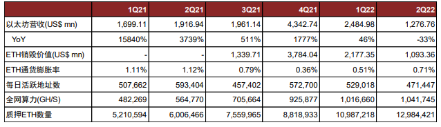 从整个以太坊网络交易费用来看:2Q22以太坊交易费用总额为12.77亿美元(产生的Gas费用),同比减少33.4%,减少的原因在于2Q22加密货币市场进入冷静期,相关的交易量大幅减少。同时,由于EIP-1559提案的实行(ETH销毁机制),2Q22相比2Q21出现了10.93亿美元的销毁值,同时叠加2Q22加密市场情绪下滑(产生的区块数降低,区块奖励减少),因此ETH通胀率同比有明显的下滑。