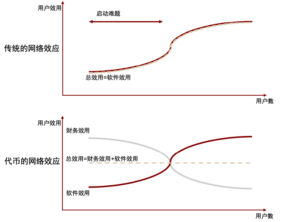 在Web3.0的愿景中,如果最终大规模建立去中心化线上社区(即大范围网络效应),那么底层的重要的动力源头之一是经济激励(即Token)。根据加密风投机构A16z创始人Chris Dixon的观点,传统的网络效应往往冷启动困难,而采用Token体系的Web3.0则在早期采用代币的财务效用(即经济激励效用)来引导用户加入,以弥补早期本地效用的不足,更快速地打造网络效应。