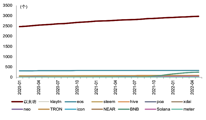 从总锁仓量上看,以太坊占据生态的领导地位。锁仓量(TVL)是在任何一个去中心化应用生态中用户质押的加密货币总价值,其背后反映的是用户对该应用的信任程度,以及该应用的流动性充裕程度等,因此是评价公链应用生态发展成熟度重要指标。根据DefiLlama显示的2022年9月的总锁仓价值排名,EVM相关的代币占比较高,其中以太坊占近60%,虽然其自身占比在下降,但EVM系仍然占据绝对优势,Top10公链中仅Solana非EVM公链。以太坊凭借智能合约理念的先发优势以及社区成熟度的不断推动,使EVM成为智能合约事实上的标准,整体生态优势显著。