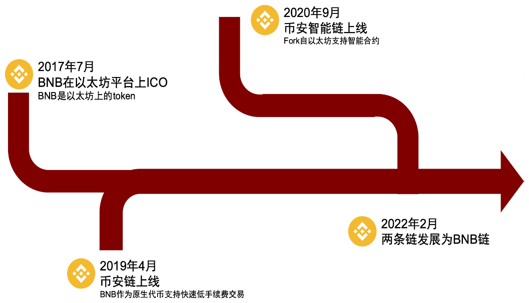 BNB链是Binance(币安)建立的EVM兼容链,快速且交易费用低。BNB是Binance 2017年在以太坊上发行的ERC-20 token,总量限定为2亿枚且会定期回购销毁,用户持有BNB可以降低在币安上交易的手续费。随着BNB生态的发展,币安于2019年推出了以BNB作为原生代币的币安链Binance Chain,以满足Binance DEX高吞吐量、低延迟、低交易费用的需求,但缺少智能合约功能。2020年9月,币安又推出了分叉自以太坊的币安智能链BSC来实现智能合约的功能。2022年2月,币安链(更名为BNB信标链,作为质押和投票的治理专用层)和币安智能链(更名为BNB智能链,作为EVM执行层)发展成一个统一的模块化系统,统称为BNB链。