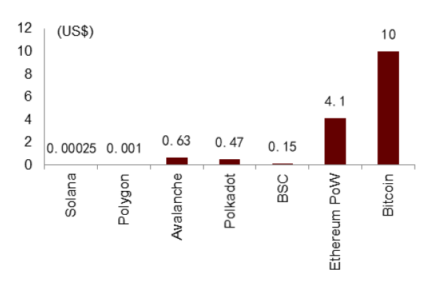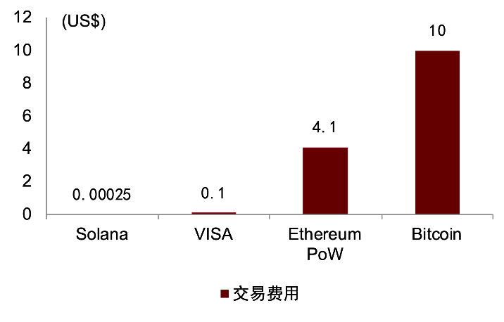 从交易费率上看,公链交易费率与交易效率有一定反比关系。以太坊每个区块都有设定gas上限,以防矿工阻塞其他节点,因而网络繁忙时gas价格较高。其他公链则通过加快出块速度从而使单笔的交易费用更低,或将多笔交易打包成一个大的交易来降低单笔交易费用。