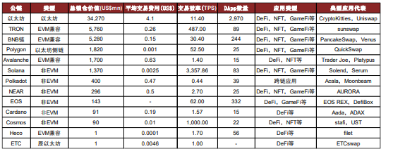 其他公链:群雄逐鹿时代。除了以太坊之外,其余公链可以分成两类:第一类为EVM兼容链,例如币安的BNB chain,可以高效复用以太坊的生态,并叠加币安生态、高速度和低费用等优势争取份额。第二类是非EVM兼容链,典型案例有:Solona基于独特的PoH共识机制,每秒可处理6.5万笔交易,媲美Visa,但妥协了一定的去中心化;Polkadot则尝试建立一条打通不同公链生态的公链,实现跨链通信;基于更新技术的Aptos、Sui等公链也计划陆续推出。