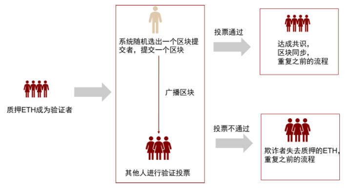 The Merge后,以太坊彻底转向PoS共识机制。参与验证的节点质押所持有的ETH,系统随机选取一个节点成为验证者来进行记账,记账结果由其余验证节点投票通过即可上链。当验证者被发现有恶意行为或不作为时,该节点将失去所有质押的ETH,因此使得攻击整个系统的成本更高。实际上,采用PoS的以太坊信标链已于2020年12月上线,作为以太坊PoS共识的试验田,标志着以太坊进入Serenity阶段。2022年9月中旬转为PoS的“The Merge”完成后[5],现存的以太坊主网将作为新以太坊的执行层,负责处理交易和数据;信标链作为共识层,为执行层结果提供共识和安全性,两者真正合二为一,以太坊进入PoS机制时代。