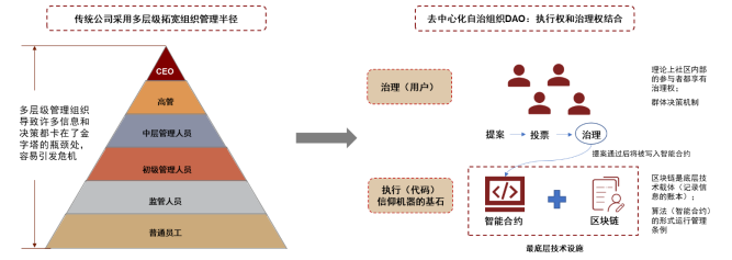 实际上,传统公司组织管理半径核心限制之一就是层级变多,中介机构变多导致中间环节利益寻租带来整体效率降低。而Web3.0的方案则是,对于已知且可量化的流程,利用区块链和智能合约的组合,可以实现高效执行,这样有希望很大范围降低管理层级,提升组织管理半径。典型案例为DAO组织,DAO将日常的常规治理交予智能合约,而将某些重要的决策交予内部投票机制(同时投票机制也由智能合约决定),重要决策在通过之后也会被写入智能合约。精简了管理层级,扩张了组织管理半径。