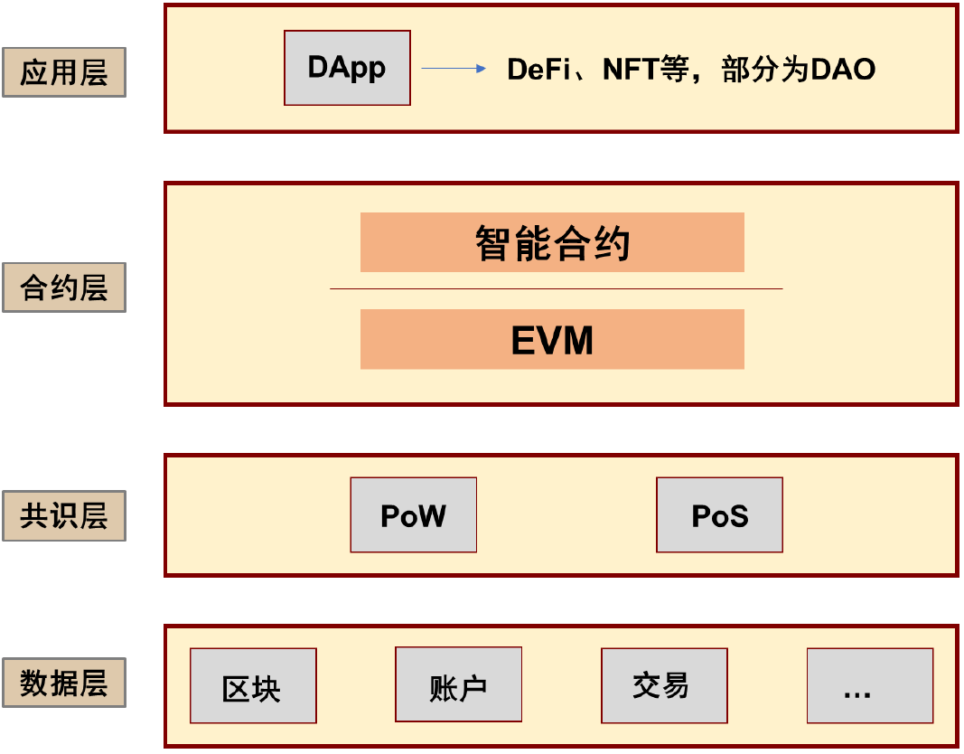 目前以太坊生态架构被分为四层:由下至上,分别是数据层、共识层、合约层、应用层(外部)。在区块链技术的基础上,上层应用体系由不同应用所编写的智能合约实现,而合约由EVM执行(EVM是以太坊抽象出的、运行在所有以太坊节点上的虚拟计算机),并通过共识机制保证不同节点间的一致性。