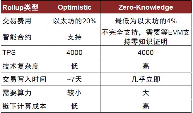 • Rollups目前有基于欺诈检测的Optimistic Rollup、基于密码学理论的ZK Rollup等,总的来说ZK Rollup在安全性、拓展性和可验证最终性上优于Optimistic Rollup,因此呼声更高。