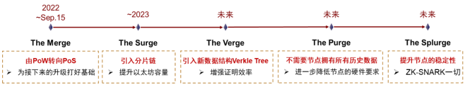 以太坊正在升级与其本身发展目标契合即更绿色、更安全、更高效。Vitalik在2022年7月21日的EtdCC上再次宣布了以太坊未来路线图,升级路线总共按照五步进行:“The Merge”已于2022年9月15日左右进行,共识机制由PoW转向PoS,为接下来的分片扩容打下基础;“The Surge”阶段以太坊将通过分片技术增强扩展性,使得每秒交易量TPS可达到10万,以太坊基金会预计在2023年上线;后续的“The Verge”、“The Purge”阶段将引入新的数据结构、降低以太坊的硬件需求(减少网络阻塞);“The Splurge”阶段将继续升级,提升整体使用体验,比如最终采用ZK-SNARK(零知识证明)。短期来看,近期目标以“The Merge”(转共识机制)和“The Surge”(分片)为主,Vitalik称最终可以实现用户使用普通PC和手机加入以太坊。