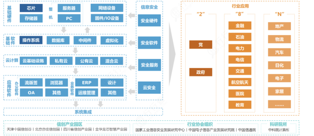 信创涉及到的行业包括(1)IT基础设施:CPU芯片、服务器、存储、交换机、路由器、各种云和相关服务内容,(2)基础软件:数据库、操作系统、中间件,(3)应用软件:OA、 ERP、办公软件、政务应用、流版签软件,(4)信息安全:边界安全产品、终端安全产品等。
