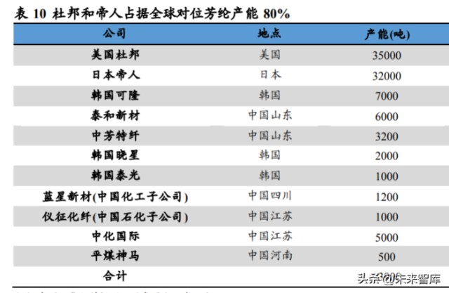 对位芳纶国内进口依赖严重,进口替代空间广阔。截止2021年,全球共 有对位芳纶产能约 9.3 万吨,于当前全球需求相当,其中国内需求约在 3 万吨以上,高度依赖于进口。目前全球产能主要高度集中于杜邦公司、 帝人等行业巨头,杜邦和帝人分别拥有对位芳纶产能 35000 吨和 32000 吨,合计占据全球产能的 80%以上,且多集中于中高端领域。国内对位 芳纶突破较晚,规模化生产企业较少,仅泰和新材、中蓝晨光、中芳特 纤等企业产品能够规模化供应市场。预计随着国内产业的进步、芳纶改 性、测试能力等发展,国内对位芳纶有望逐步实现从低端到高端的渗透, 未来国产对位芳纶进口替代空间广阔。