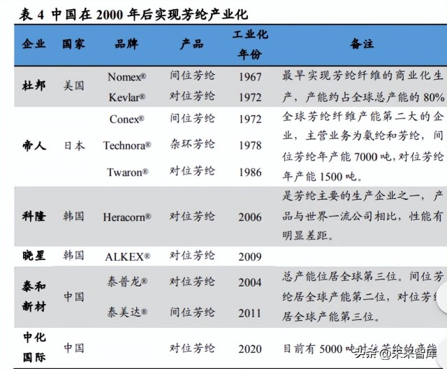 芳纶诞生于 20 世纪 60 年代的美苏冷战时期,最早作为美国航空材料开 发。冷战结束后随着芳纶被逐步应用民用领域实现了军用战略物资到民 用产品的过度。国际上率先实现芳纶商业化应用的是美国杜邦公司,其 于 1960 年小试成功间位芳纶,并于 1967 年开始生产对应的工业型号 Nomex。1972 年杜邦公司的对位芳纶 Kevlar 实现工业化,同年日本帝人 实现间位芳纶 Conex 的生产。此后荷兰阿克苏诺贝尔、赫斯特等厂商逐 步实现了芳纶的产业化。 早期芳纶产能多集中于美国、日本以及欧洲,随着芳纶规模化生产日趋 成熟,我国也开始芳纶纤维的开发。早在 1986 年的“七五”期间,国内 就有东华大学化纤研究所、晨光化工研究院、上海合成纤维研究所、沈 阳市红星密封材料厂等单位开始研制和生产对位芳纶,但受制于资源, 成本等原因芳纶产业化进度缓慢。二十一世纪开始,国内芳纶产业化开 始突破,2004 年,泰和新材实现了间位芳纶的量产,随后 2011 年其对 位芳纶也实现了工业化。2010 年间,苏州兆达借助东华大学的技术积累 成为国内售价对位芳纶企业,随后中化国际基于苏州兆达的积累在 2020 年底完成了 5000 吨对位芳纶产能建设。