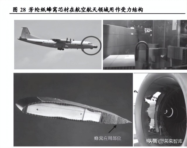 芳纶纸蜂窝芯材作为夹层结构复合材料用芯材之一,其具有天然蜂巢的 六边形结构,用其制备成的夹层结构具有比强度高、比刚度大、结构稳 定性强、隔音、隔热、阻燃、燃烧时烟量少且毒性小等优点,是间位芳纶 在高端航空航天及高速运输领域重要的应用方向。