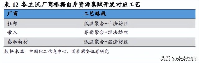 间位芳纶生产工艺选择性多于对位芳纶,过程上由缩聚+纺丝构成,根据 不同工艺路线,不同厂商选择低温聚合法+干法纺丝工艺(美国杜邦)、界 面聚合法+湿法纺丝工艺(日本帝人)或低温溶液聚合法+湿法纺丝工艺 (泰和新材),纺丝阶段,间位芳纶采用一步法工艺,即低温溶液间歇聚 合,原液经过过滤后直接进行湿法纺丝,水洗后干切,切断后打包。