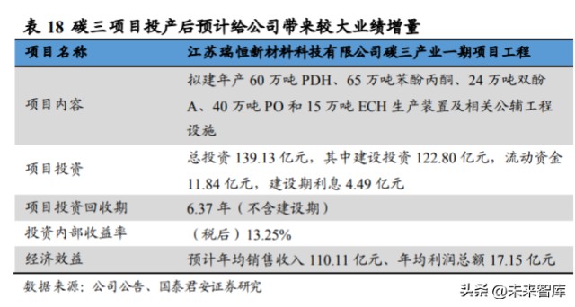 C3 项目顺利投产:公司由贸易转型持续向精细化工转型,当前 6PPD、 二氯苯、硝基氯苯产能全球前三,环氧氯丙烷、环氧树脂国内领先。在 建工程和固定资产总额逐年增长。公司在瑞恒新材料碳三项目竞争优势 突出,2022 年中逐步投产,项目规划 60 万吨 PDH、65 万吨苯酚/丙酮、 24 万吨双酚 A、40 万吨 PO 和 15 万吨 ECH。风电行业发展带动环氧树 脂需求快速增长,在环氧树脂中应用占比约 21%,2021 年风电叶片对应 环氧树脂需求约 37 万吨,此外环氧胶黏剂和环氧树脂复合材料需求快 速提升。公司环氧丙烷项目项目采取 HPPO 及双氧水法 ECH 等绿色工 艺,昂比氯醇法具备清洁、节能优势,核心产品竞争优势突出,预计全 部新建项目满负荷运行状态下利润超过 20 亿元。