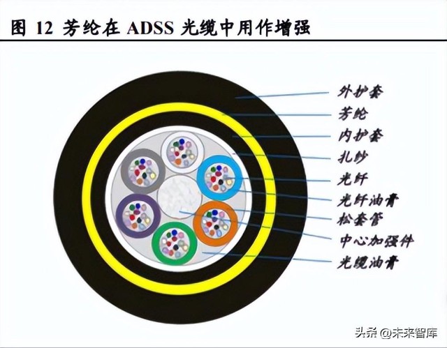 光缆需求增长拉动对位芳纶增量。对位芳纶纤维凭借高强度,高模量以 及低蠕变的性能,同时兼具优秀的化学稳定性和低热膨胀效应,成为最 理想的光缆非金属增强材料。对位芳纶纤维在室内外光纤和电力缆,室外 ADSS 光缆、室内光缆及跳线等领域广泛应用,起到显著抗拉增强作 用。