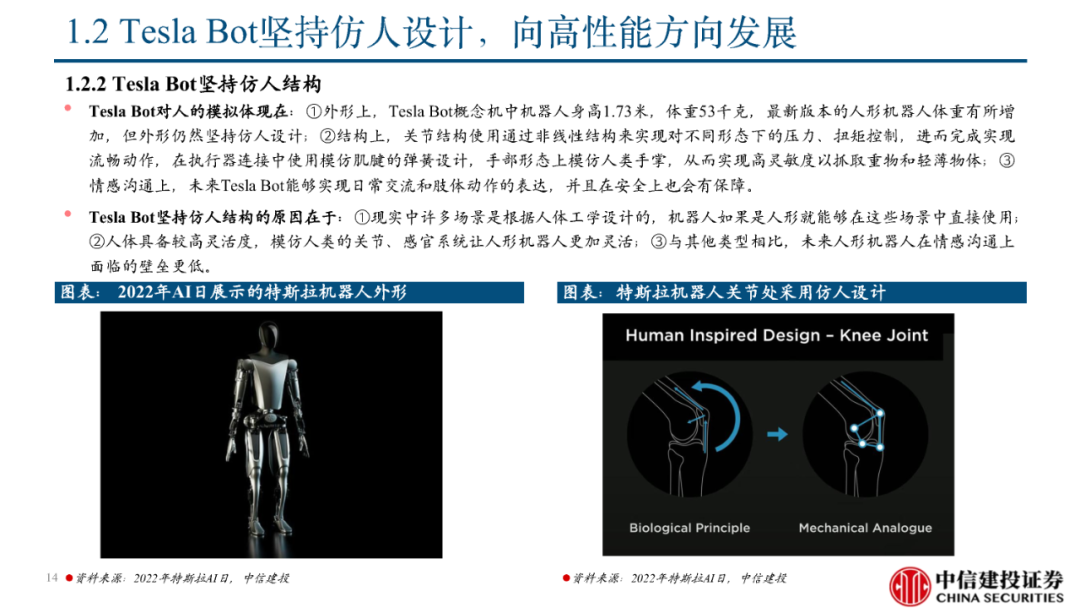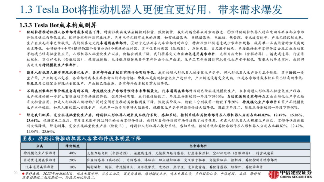 特斯拉人形机器人有望推动产业链成本下降,进而带动需求爆发。按照马斯克对Tesla Bot未来的量价指引,预计Tesla Bot会借鉴特斯拉电动车的生产、管理经验,要求供应商具备批量、低价交付能力,同时将特斯拉电动车的FSD芯片和DOJO算法应用到人形机器人上,会让机器人又便宜又好用,推动需求爆发。未来,机器人产业链零部件供应商的单价和利润率预计都会呈现下行趋势,但是以价换量,需求会极大爆发。