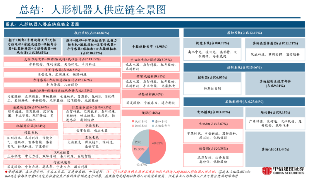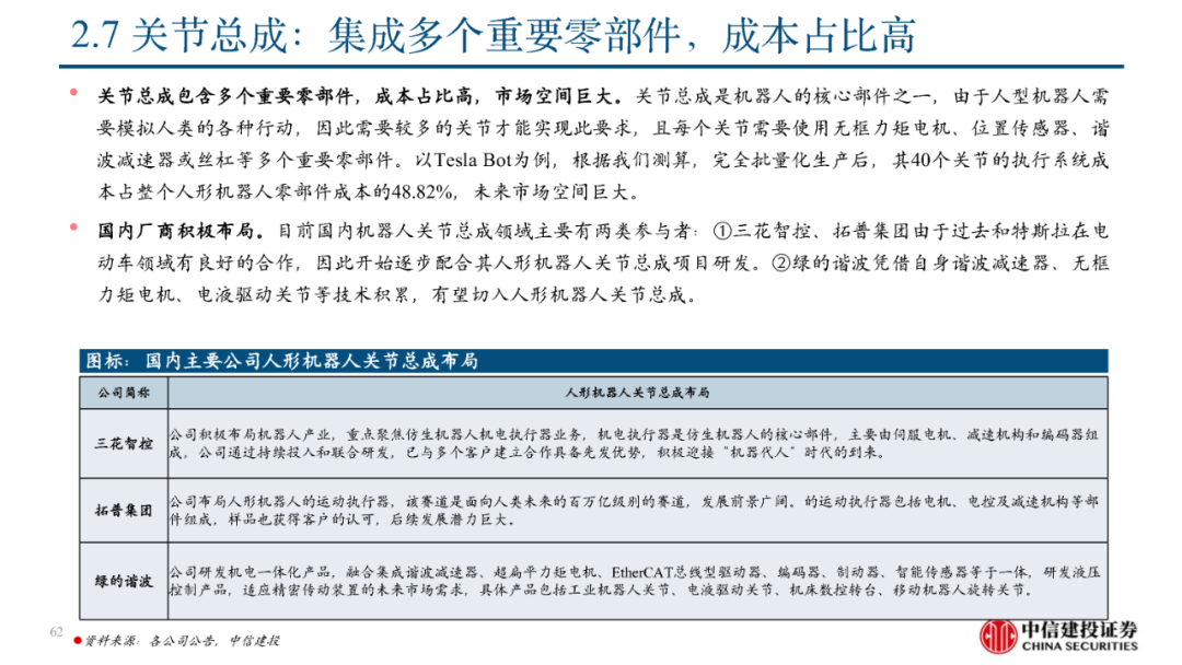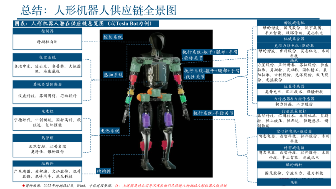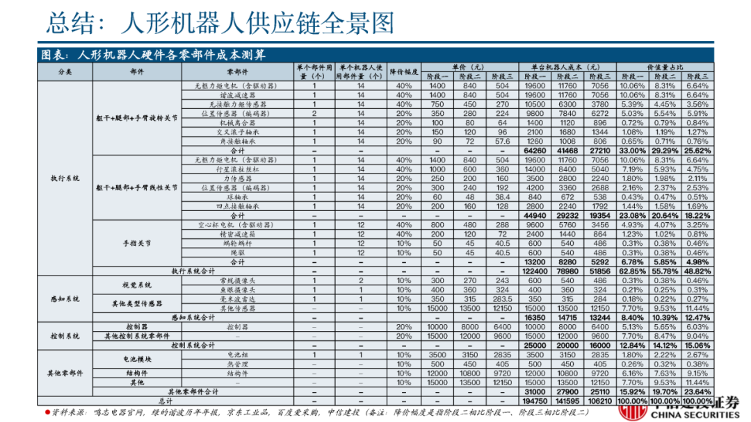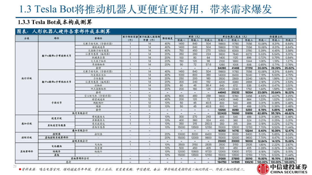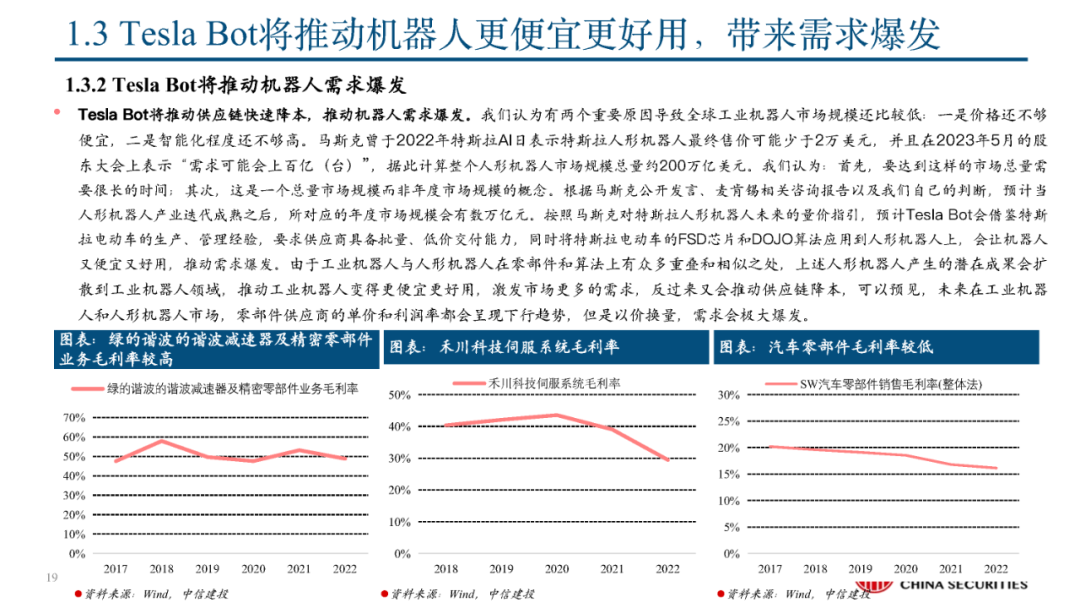 特斯拉人形机器人借鉴电动车的生产管理经验,有望推动产业链成本下降,进而带动机器人需求爆发,预计未来零部件供应商的单价和利润率预虽然会呈现下行趋势,但是可以以价换量实现市场空间的极大增长。