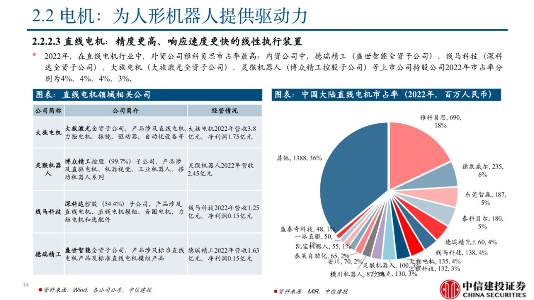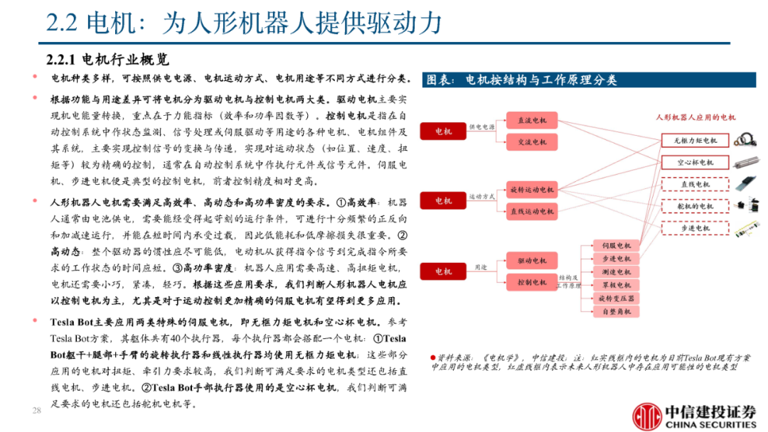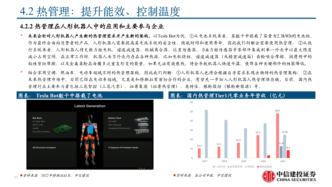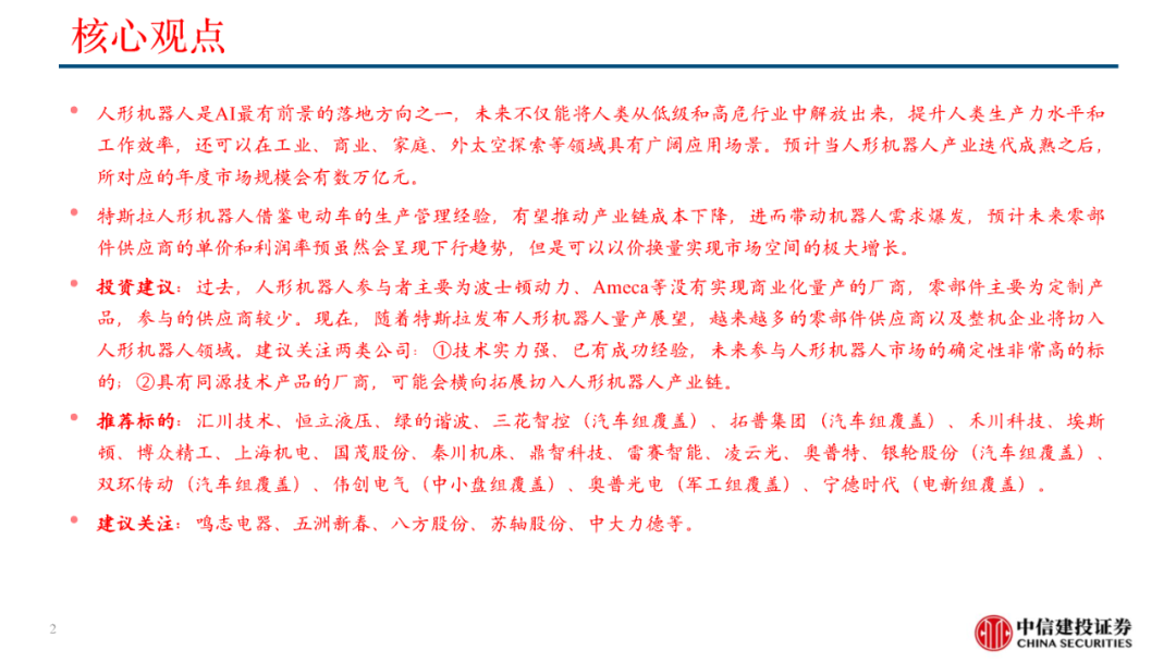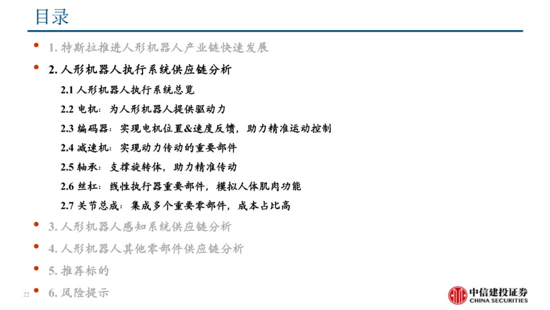 投资建议:过去,人形机器人参与者主要为波士顿动力、Ameca等没有实现商业化量产的厂商,零部件主要为定制产品,参与的供应商较少。现在,随着特斯拉发布人形机器人量产展望,越来越多的零部件供应商以及整机企业将切入人形机器人领域。建议关注两类公司:①技术实力强、已有成功经验,未来参与人形机器人市场的确定性非常高的标的;②具有同源技术产品的厂商,可能会横向拓展切入人形机器人产业链。
