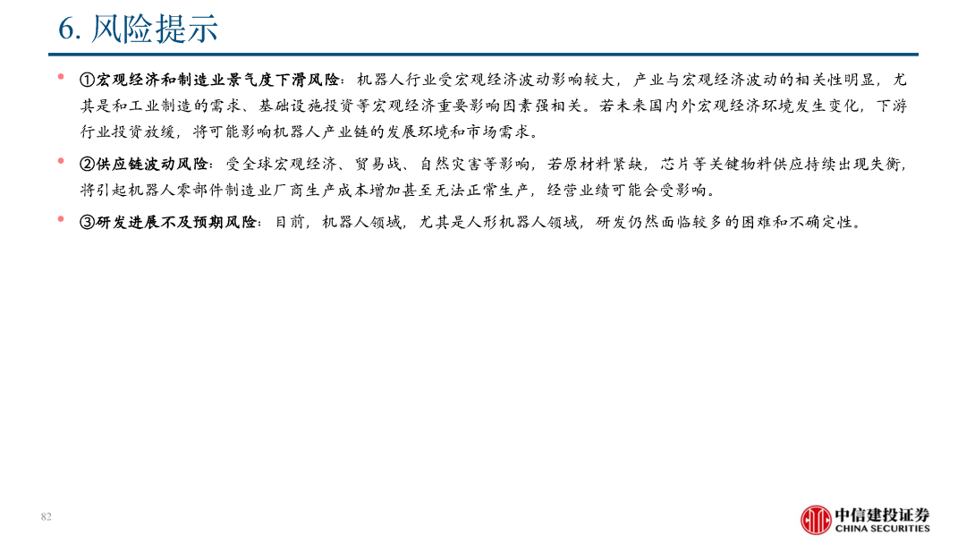 ①宏观经济和制造业景气度下滑风险:机器人行业受宏观经济波动影响较大,产业与宏观经济波动的相关性明显,尤其是和工业制造的需求、基础设施投资等宏观经济重要影响因素强相关。若未来国内外宏观经济环境发生变化,下游行业投资放缓,将可能影响机器人产业链的发展环境和市场需求。